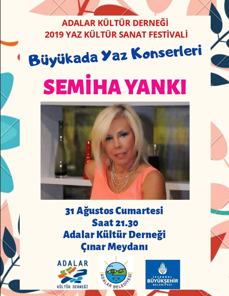 Adalar Kültür Derneği 2019 Yaz Kültür Sanat Festivali kapsamında 31 Ağustos Cumartesi günü saat 21.30'da Adalar Kültür Derneği Çınar Meydanı'nda Semiha Yankı konseri yapılacaktır. Tüm Adalılar davetlidir.